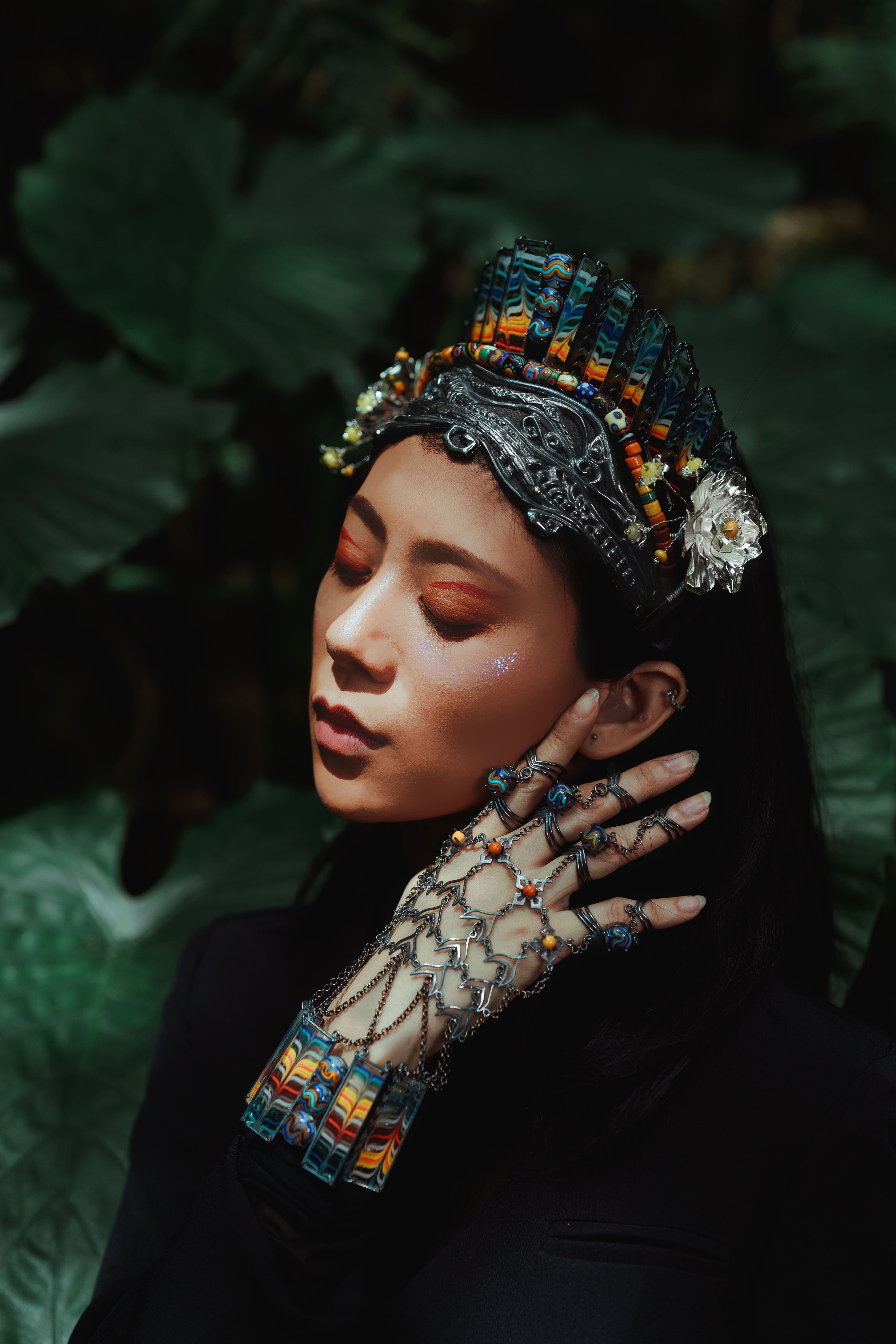 3.設計思維革新:永續設計強調經典與永恆的風格,避免因潮流快速更替造成的過度消費。此舉不僅延長產品壽命,也降低整體資源耗用。重視結合科技與傳統工藝的平衡發展,讓傳統的手工外表、內涵高度智慧的科技,融入現代生活,除了感動更具正向的價值思考。例如作品「Zemadrezadrezadr-如光一般的愛」設計元素的琉璃珠是排灣族蘊藏生命情感的結晶,以愛情神話孔雀王子作為婚禮時尚首飾發想,運用傳統琉璃技術結合金工進行設計,作品重新詮釋孔雀王子神話,並再現排灣傳統工藝之美。(創作者:鍾潔妮、洪雅芬)