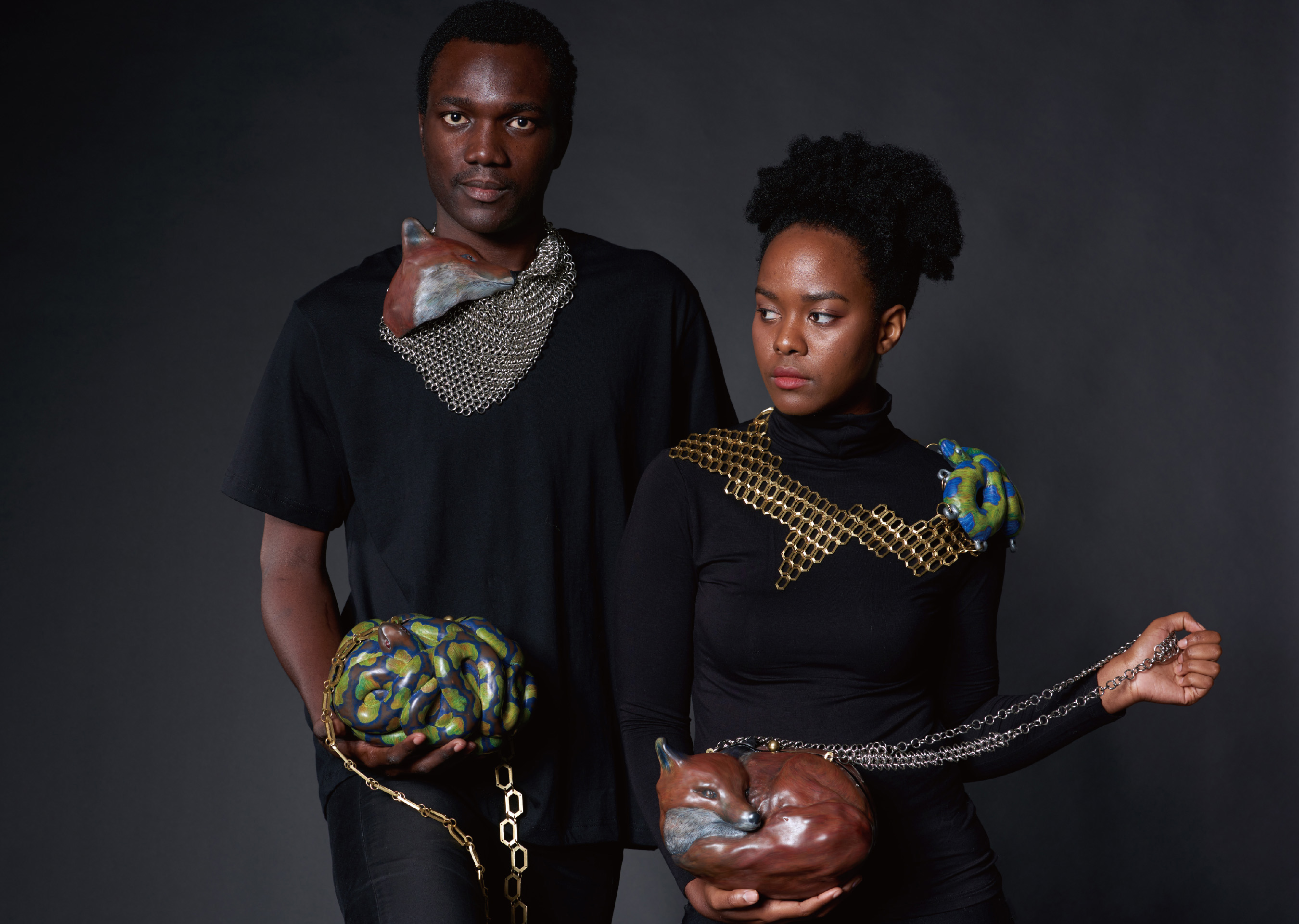 4. Supply Chain Transparency: Many sustainable crafts strive to establish publicly transparent supply chains that allow consumers to clearly understand the products’ origins and production process, thereby establishing further trust. Such crafts also encourage businesses to practice higher ethical standards, call on them to care for precious flora and fauna, and urge them to stop ecological destruction. For example, the work 432 Hertz discusses how merchants kill animals through inhumane methods purely to earn a profit from their pelts. This exploitative industry pushes precious animals to the verge of extinction. Therefore, we used foxes and snakes as our inspiration to design lifelike bags and jewelry to call on consumers to reject buying inhumane furs, and take a stand against animal cruelty. (Creators: Chia-ho Wang, Tzu-Hua Chen)