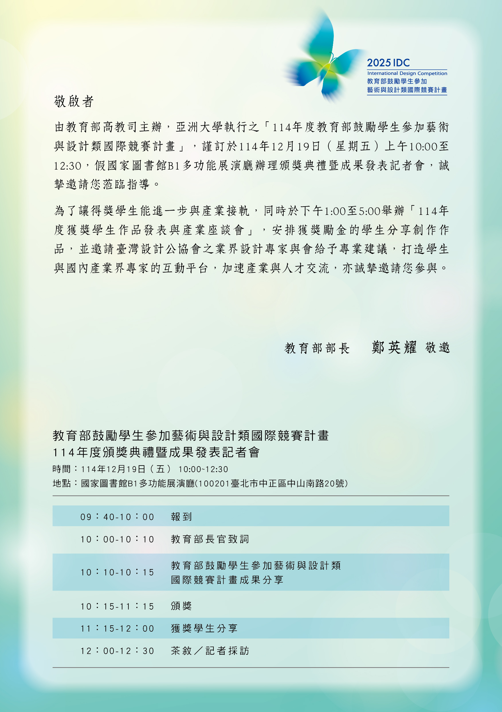 教育部鼓勵學生參加藝術與設計類國際競賽計畫將在12月19日 (星期五) 10:00至12:00於臺北國家圖書館B1多功能展演廳舉行「114年度頒獎典禮暨成果發表記者會」,活動中將會有獲獎學生分享參加國際競賽之心得,並將於B1大廳展出本年度193件獲獎作品,歡迎您蒞臨參觀設計類學子參加國際競賽之亮眼成績。
