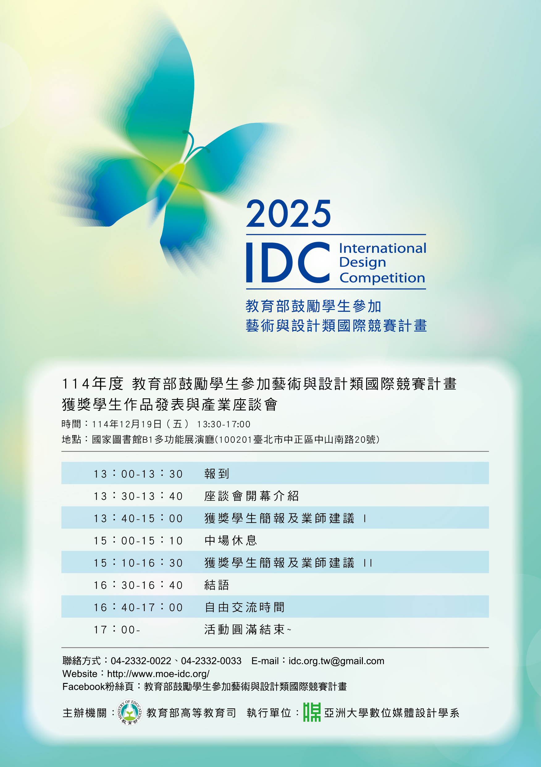 另外,為了讓得獎學生能進一步與產業接軌,教育部鼓勵學生參加藝術與設計類國際競賽計畫將於當日13:30至17:00舉辦「114年度獲獎學生作品發表與產業座談會」,將可以看到學生作品設計思路分享、業界專家現場給予指導建議,誠摯邀請您出席聆聽觀摩,了解更多設計人才所需具備進入業界的專業能力!