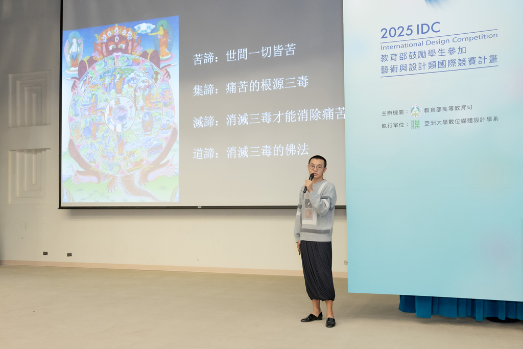 ▲亞洲大學人工智慧博士學位學程陳郭益言分享作品創作理念。