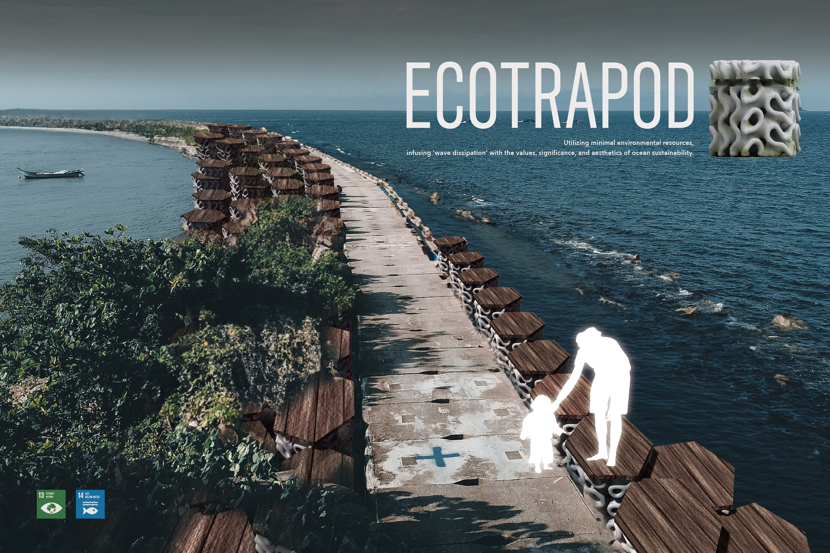 國立臺灣科技大學設計系學生林劭宇、蔣佳穎創作作品「消波新解方 Ecotrapod」,此作品是以回收牡蠣殼製成的環保消波塊,使用循環漿體取代水泥,可減少30%–90%碳排放。其Gyroid (多孔螺旋曲面)結構輕盈堅固,提供海洋生物棲息空間,兼具生態、功能與美感,實現海洋永續。本作品亦於113年獲得「美國建築大師獎 (AMP)-Student Product of the Year」,並獲得本計畫第三等全場大獎。