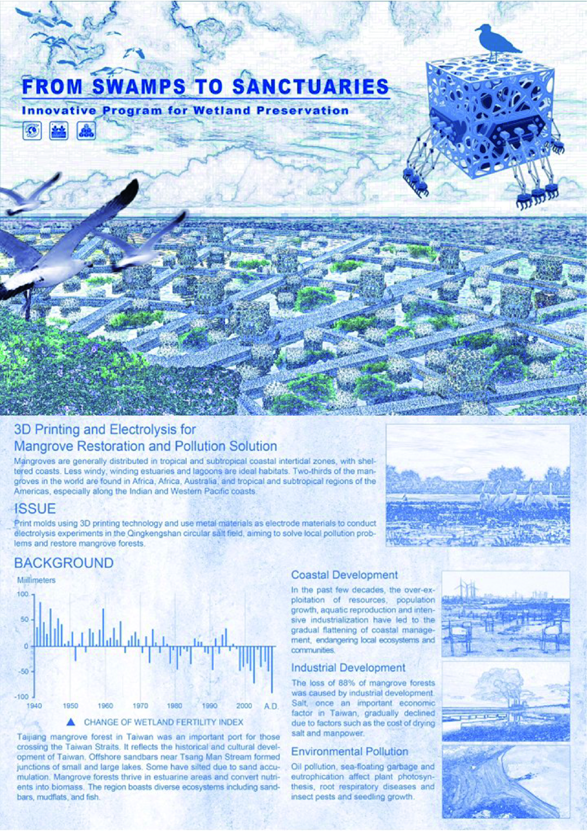 國立臺灣科技大學建築系蔡伊瑄、施善譯、簡碩德創作作品「棲境轉生:從沼澤到庇所的地景寓言 from Swamps to Sanctuaries」,結合3D列印與電解實驗於紅樹林復育,於青鯤鯓鹽田打造具導引性的模具,改善水質與底泥、促進生態修復。設計回應污染議題,並納入藍色經濟思維,提出自然與科技共構的永續行動方案。此作品亦於113年獲得「2024 美國建築大師獎-Best of Best」,並獲得本計畫第一等銅獎。▲棲境轉生:從沼澤到庇所的地景寓言 from Swamps to Sanctuaries