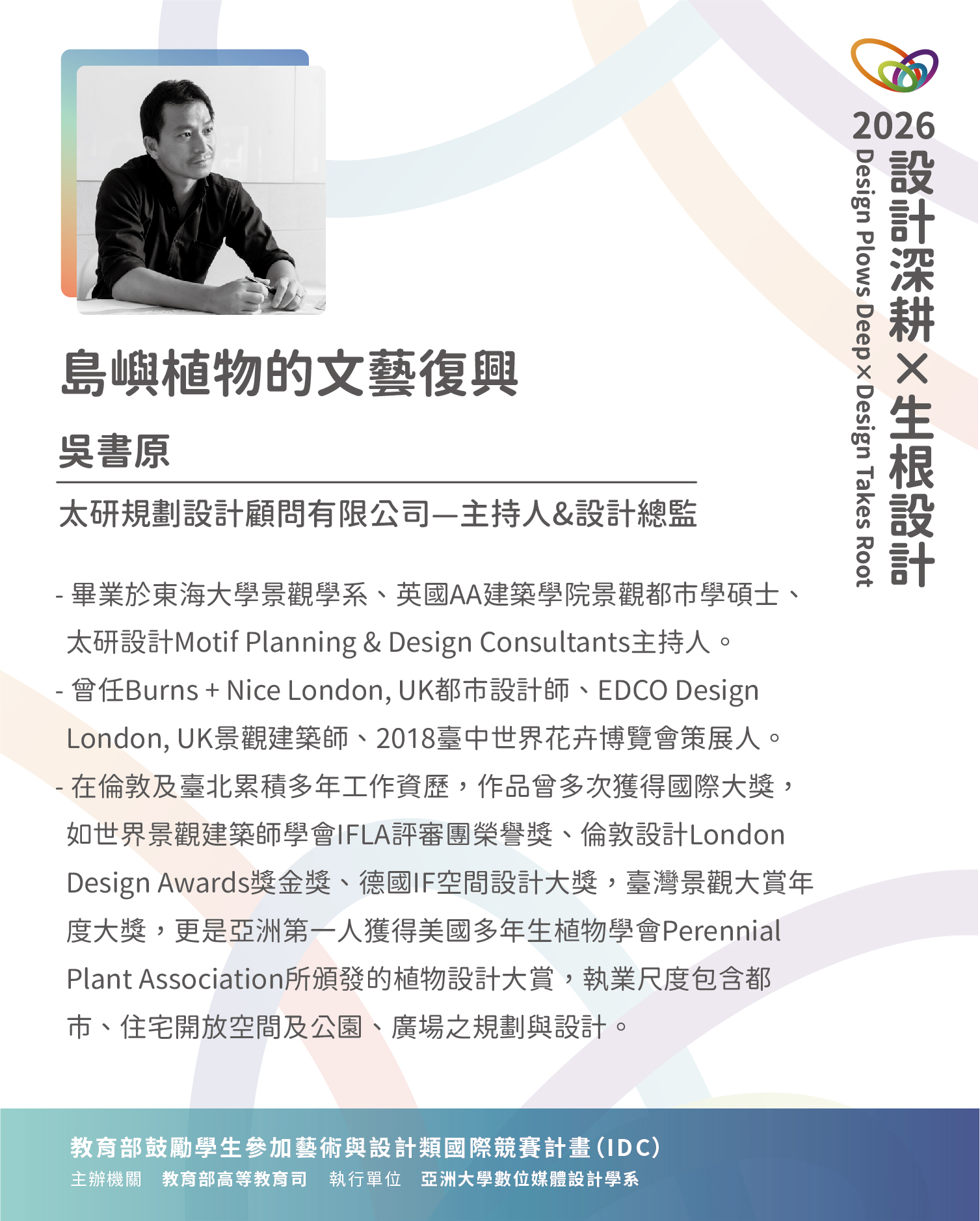 .畢業於東海大學景觀學系、英國AA建築學院景觀都市學碩士、太研設計Motif Planning & Design Consultants主持人